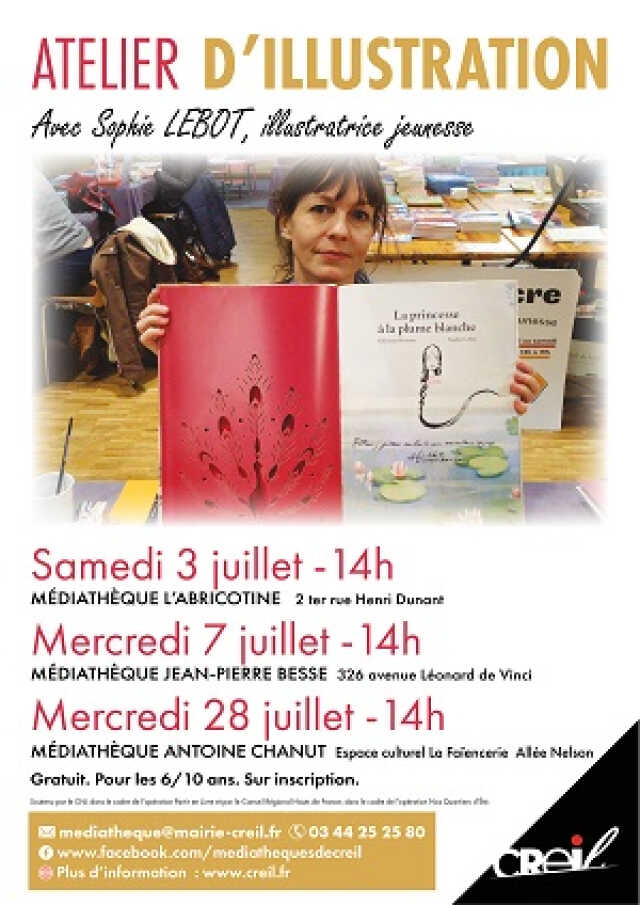 Le 28 juillet, découvrez l'atelier d'illustration avec Sophie Lebot, illustratrice jeunesse. Approche des différentes techniques : encres, crayons de couleur, tampons, collages, peintures... Pour les enfants de 6 à 10 ans. Sur inscription.