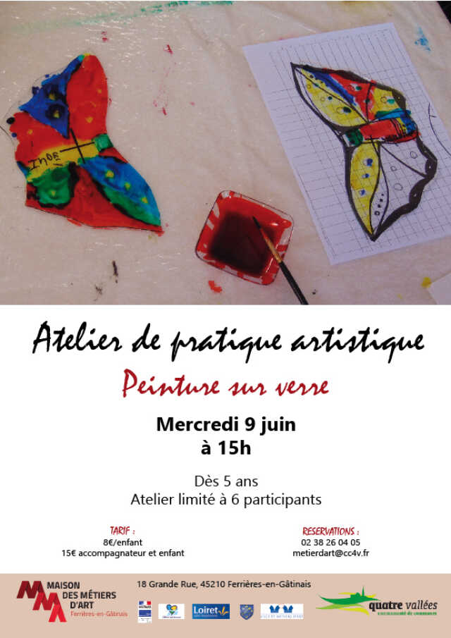 La Maison des Métiers d'Art vous propose un atelier " Peinture sur verre " le mercredi 9 juin à 15h. Dès 5 ans, places limitées. Réservations obligatoires au 02 38 26 04 05 ou metiersd'art@cc4v.fr. Tarif : 8€ / enfant ou 15€ / enfant+accompagnateur.