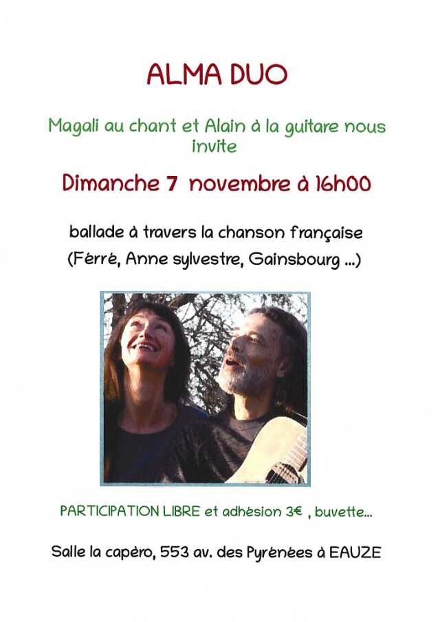 Concert Alma Duo : Magali au chant et Alain à la guitare nous invite le dimanche 7 novembre à 16h.