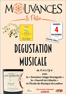 Le café culturel associatif " Le Patio " animé par l'association " Mouvances " vous propose une dégustation musicale en collaboration avec l'école de musique de Lodève et le domaine " Calage Ressiguier " et le restaurant le " Fournil de Célestin ".
