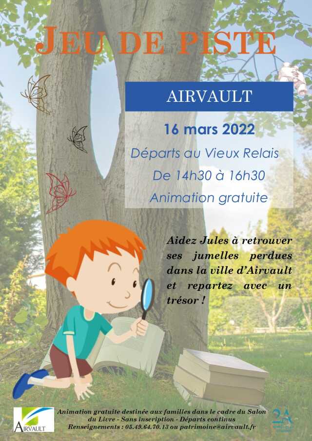 Un jeu de piste familial lié à la nature et l'environnement est proposé, un avant goût du salon du livre qui se tient les 19 et 20 mars à Airvault, ayant pour thème " Voyages et nature ". Départs du Vieux Relais à Airvault. les enfants vont devoir aider le petit Jules à retrouver les jumelles qu'il a perdu dans le centre-ville d'Airvault, départs et arrivées au Vieux relais. Les départs sont continus entre 14h30 et 16h30, récompense pour ceux qui retrouveront les lunettes ! Tous les enfants seront récompensés. Remises des lots au Vieux Relais. Découvrez le programme complet du salon du livre des 19 et 20 mars, dans les images.