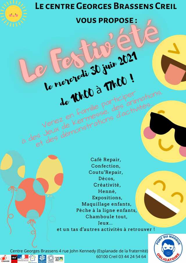 Venez en famille participer à des jeux de kermesse, des animations et des démonstrations d'activités... le mercredi 30 juin 2021 de 10h00 à 17h00 sur l'Esplanade de la Fraternité ( devant le centre Georges Brassens à Creil ).