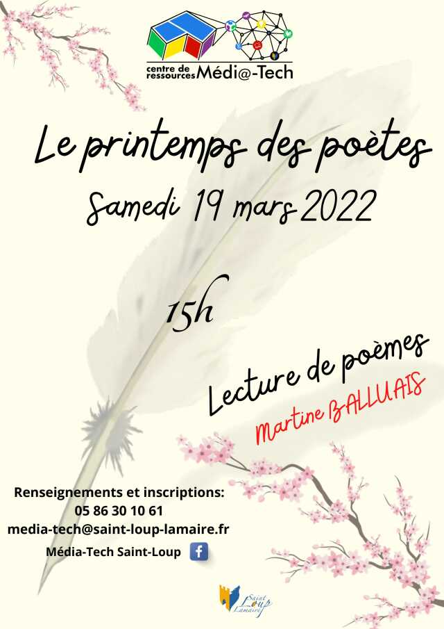 Dans le cadre du Printemps des Poètes, venez écouter des lectures de poèmes, de Martine Balluais, à 15 h à la Média-tech de Saint-Loup-Lamairé. Renseignements et inscriptions : 05 86 30 10 61 / media-tech@saint-loup-lamaire.fr
