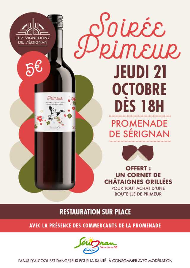 Découvrez les notes fruitées, la rondeur et la légèreté de ce tout nouveau vin primeur signé Cave Coopérative Les Vignerons de Sérignan Pour tout achat d'une bouteille d'un montant de 5€ un cornet de châtaignes grillées vous sera offert.