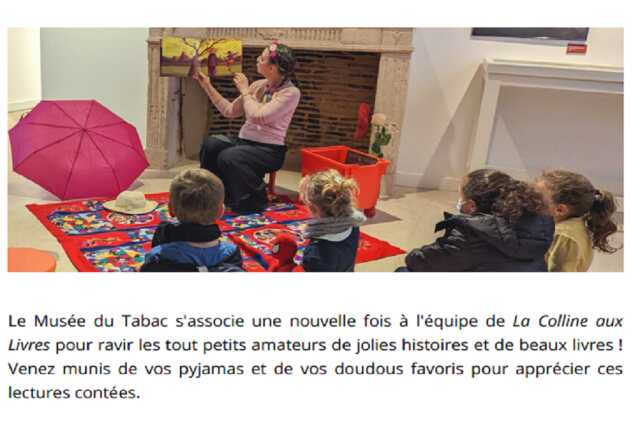 Pour les enfants de 2 à 5 ans ( munis de leurs doudous ! ), des lectures au Musée du Tabac sont proposées, en partenariat avec la librairie La Colline aux Livres.