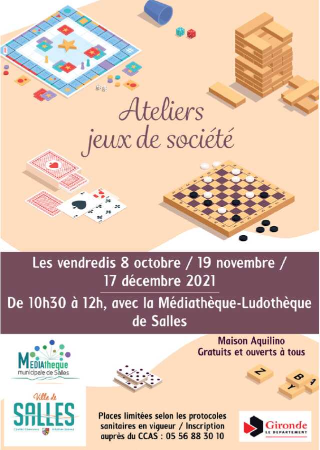 Le CCAS de Salles organise, en collaboration avec la médiathèque-ludothèque, un atelier jeux de société le vendredi 8 octobre de 10h30 à 12h, à la maison Aquilino.