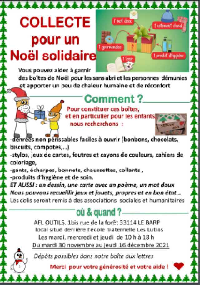 L'AFL OUTILS recueille vos dons pour compléter des boîtes de Noël pour les sans-abri et personnes démunies, et plus particulièrement les enfants.