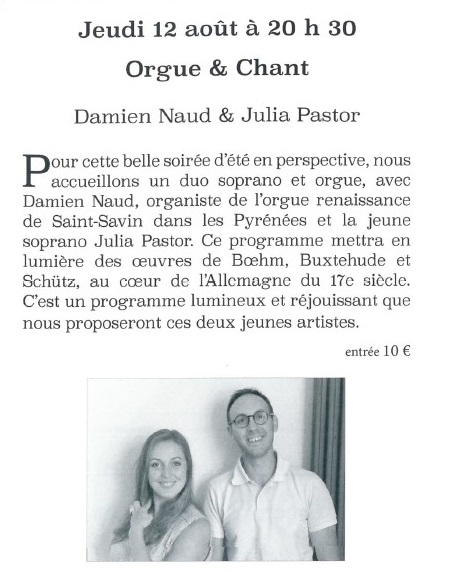 Pour cette belle soirée d'été, place au duo soprano et orgue, avec Damien Naud, organiste de l'orgue renaissance de Saint-Savin dans les Pyrénées, et la jeune soprano Julia Pastor. Ce programme mettra en lumière des œuvres de Boehm, Buxtehude et Schütz, au cœur de l'Allemagne du 17e siècle. C'est un programme lumineux et réjouissant que proposerons ces deux jeunes artistes.