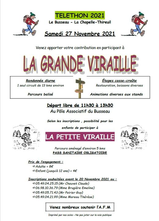 La grande Viraille est organisée par le comité des fêtes, le 29 novembre 2025 Marche au profit du téléthon , départ libre de 11h à 12h30 depuis le pôle associatif. Réservation obligatoire, avant le 23 novembre au 06 15 32 53 34 (sms uniquement) Tarif : 12 euros