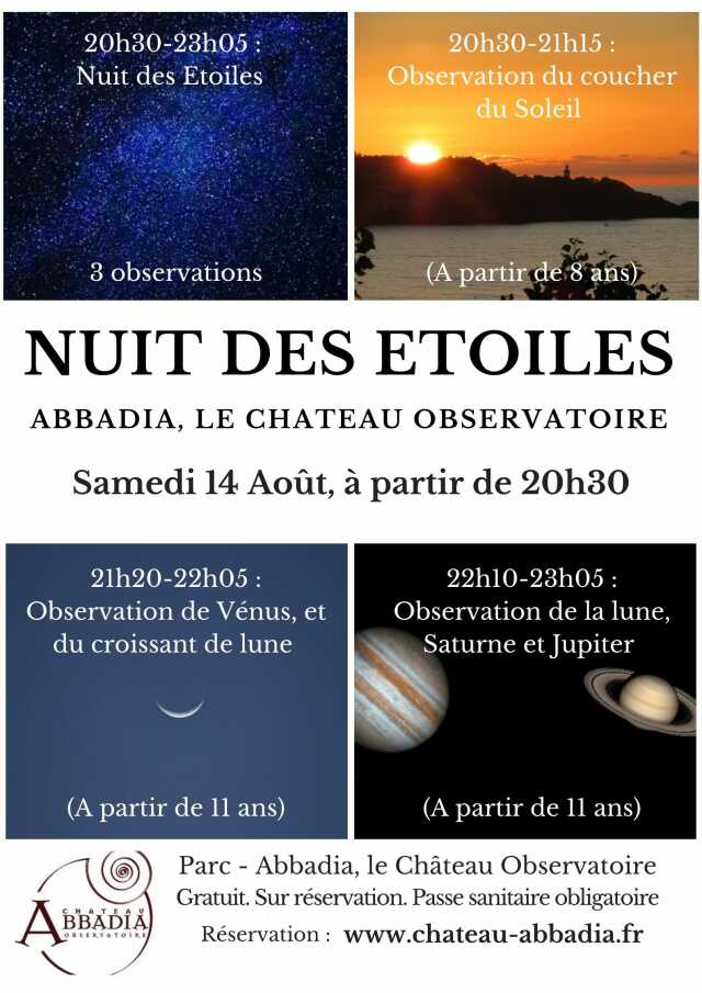 Dans le Parc du Château Abbadia, nouvellement restauré, la Société d'Astronomie Populaire de la Côte Basque propose 3 ateliers d'observation du Soleil, de la Lune, de Vénus, Saturne et Jupiter... entre autres.