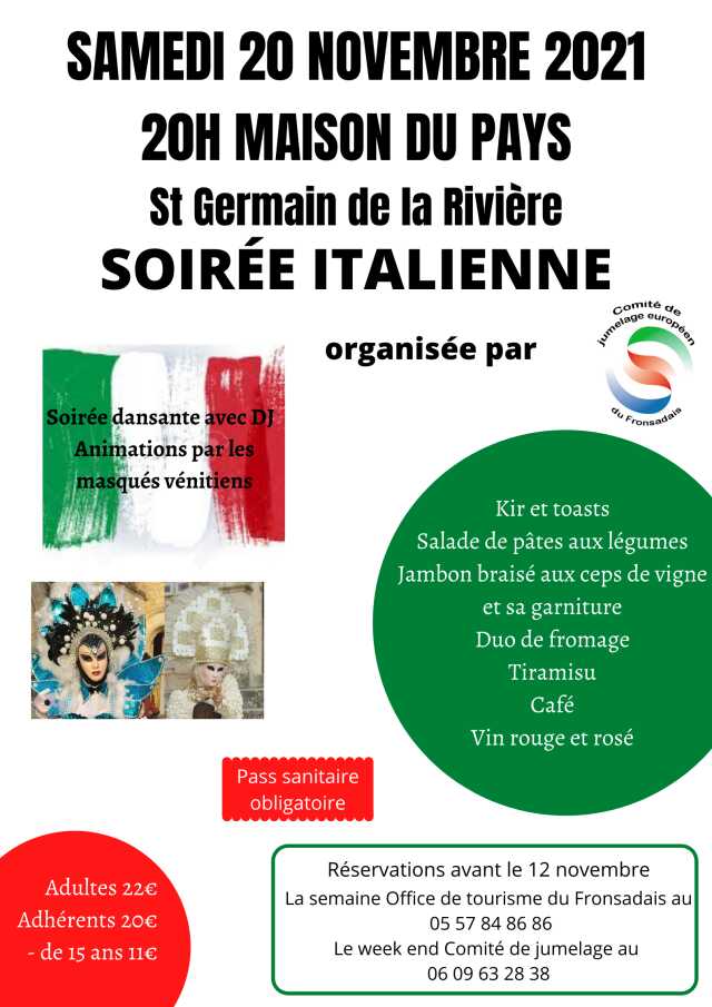 Soirée festive organisée par le Comité de Jumelage Européen du Fronsadais. Au menu: apéritif et amuses bouche minestrone jambon braisé et sa garniture duo de fromages chouquettes garnies café