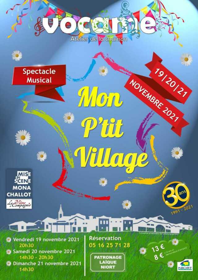 Grâce au soutien d'une metteuse en scène professionnelle, Mona Challot de la " Dame de Compagnie ", l'atelier de la chanson Vocame, qui cette année fête ses 30 ans d'existence, vous présente son spectacle entièrement théâtralisé : " Mon P'tit Village ". Des interprétations en duo, en chœur ou en petit groupe. Du rythme et de la fantaisie !