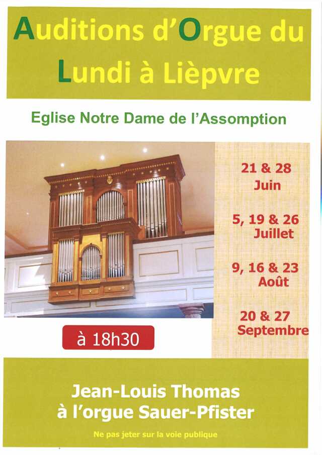 Des auditions d'orgue seront organisées les lundis soir à partir de 18h30 à l'église Notre Dame de l'Assomption à Lièpvre aux dates suivantes :