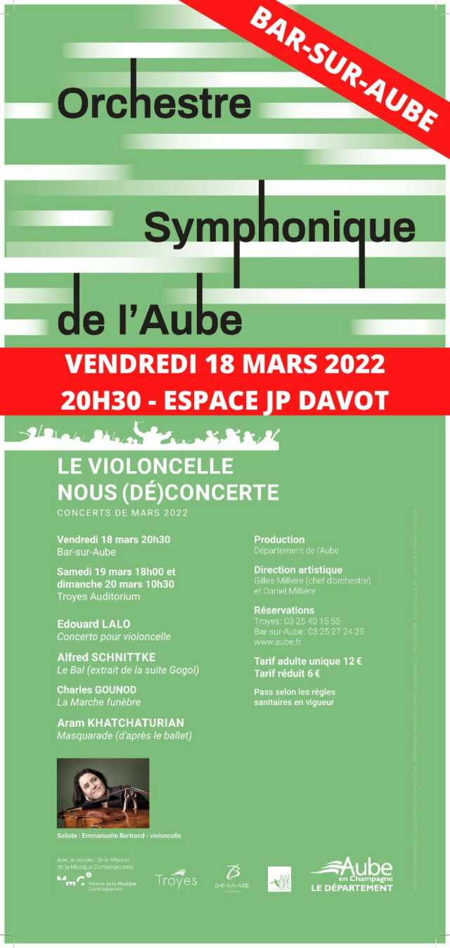 L'Orchestre Symphonique de l'Aube est de passage à Bar-sur-Aube le vendredi 18 mars 2022 à 20h30 à l'Espace Jean-Pierre DAVOT pour un répertoire autour du Violoncelle avec la soliste Emmanuelle BERTRAND.