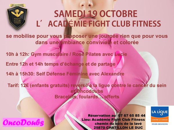 Samedi 19 octobre de 10h à 15h30, Alexandre et Lucie se mobilisent pour vous proposer des cours de gym musculaire et de self défense féminine. Entre 12h et 14h vous pouvez apporter votre repas il y aura un temps d'échange et de partage avec la ligue du cancer du sein.