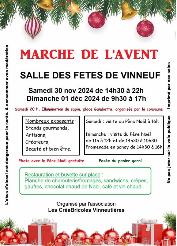Nous sommes au complet niveau exposants . L'association les créabricoles vinneutières organise son deuxième marché de l'avent à vinneuf (89) et avec le succès que nous avons eu l'année dernière, nous avons décidé de le faire sur deux jours : du samedi 30 novembre 2024 au dimanche 1 décembre 2024 à partir de 14h30/22h pour le samedi et 9h30 à 17h pour le dimanche. nous aurons un/des gardien/s sur place pour la nuit.