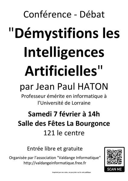 L’association « Valdange Informatique » organise une conférence-débat sur les Intelligences Artificielles (IA) animée par Jean Paul HATON (Professeur émérite en informatique à l’Université de Lorraine) le samedi 7 février à 14h à la Salle des Fêtes (121 le centre) de La Bourgonce.