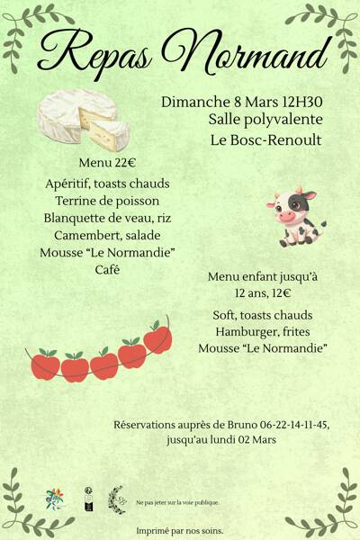 Le comité des fêtes de Le Bosc-Renoult organise un repas Normand le dimanche 08 mars 2026, à la salle polyvalente, à 12h30.