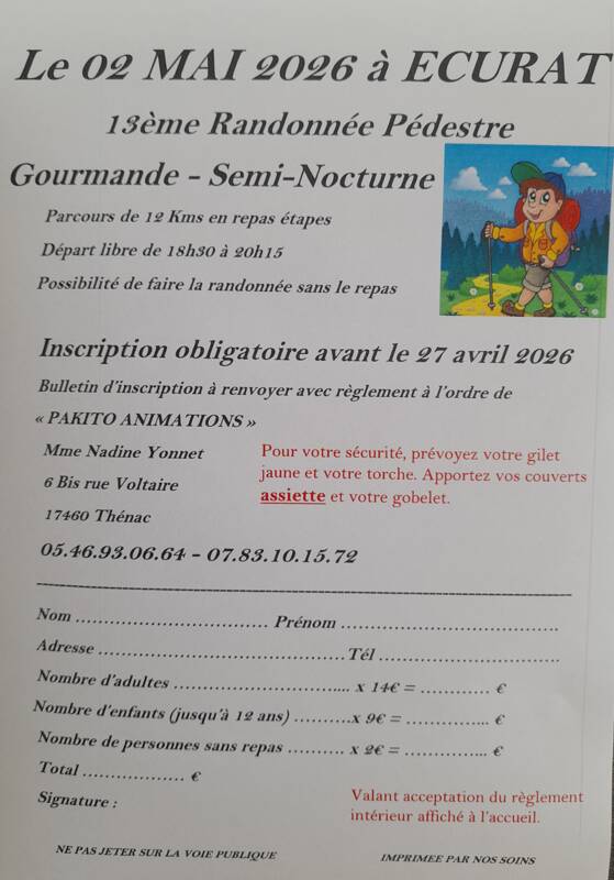 Inscription obligatoire avec règlement à l ordre de Pakito animations, à envoyer à Mme Yonnet Nadine, 6Bis rue voltaire 17460 Thénac