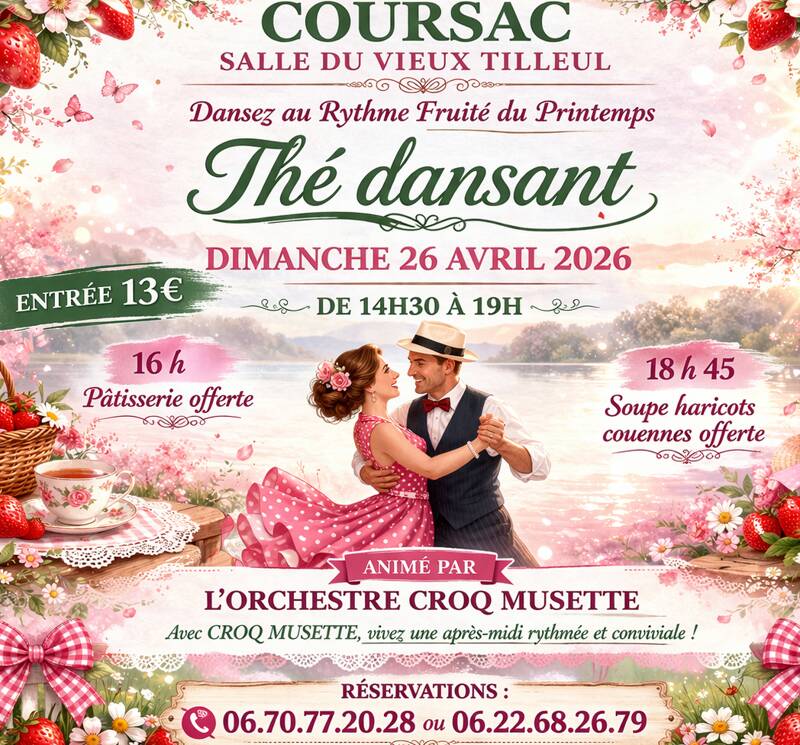 Le dimanche 26 avril 2026, la commune de Coursac vous invite à un grand thé dansant à la Salle du Vieux Tilleul.