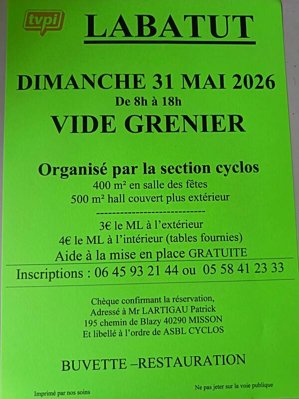 La sectio Cyclos de LABATUT (40300 ) organise un vide grenier le Dimanche 31 Mai 2026, de 8h00 à 18h00. 400 m2 en salle des fêtes, 500 m2 en hall couvert, plus extérieur.
