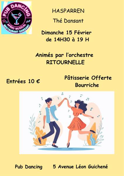 le dimanche 15 Février aura lieu au Pub Dancing à Hasparren un thé dansant animé par l'orchestre RITOURNELLE.