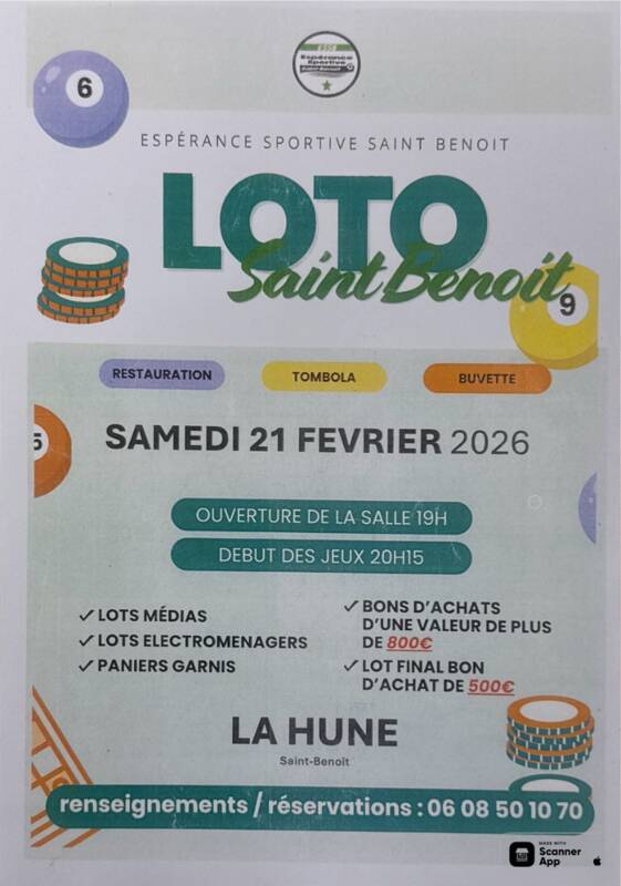 Venez participer au loto de Saint Benoît en tentant de remporter de nomreux lots et des cartes cadeaux. Réservations au : 06 08 50 10 70