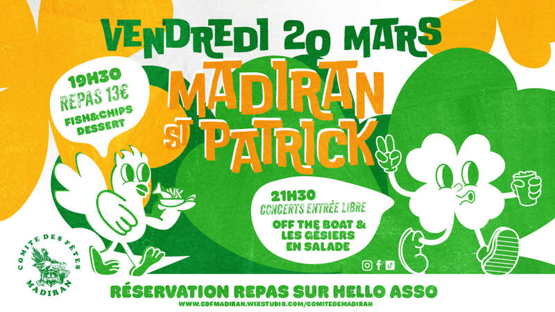 Comme d’habitude, les réservations se passent sur HelloAsso : https://www.helloasso.com/associations/foyer-rural-de-madiran/evenements/saint-patrick-2026-madiran/